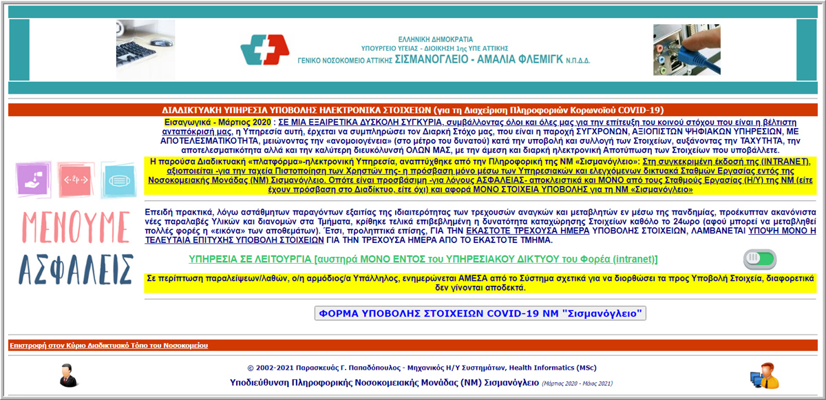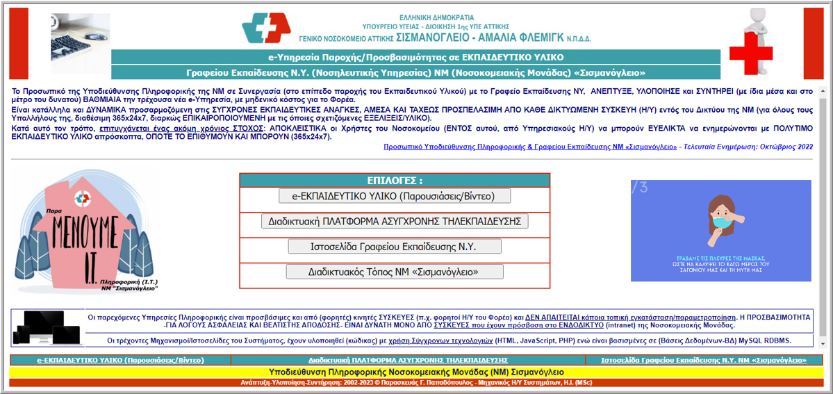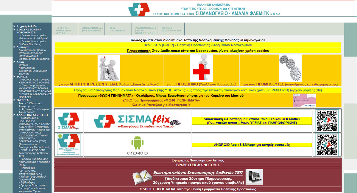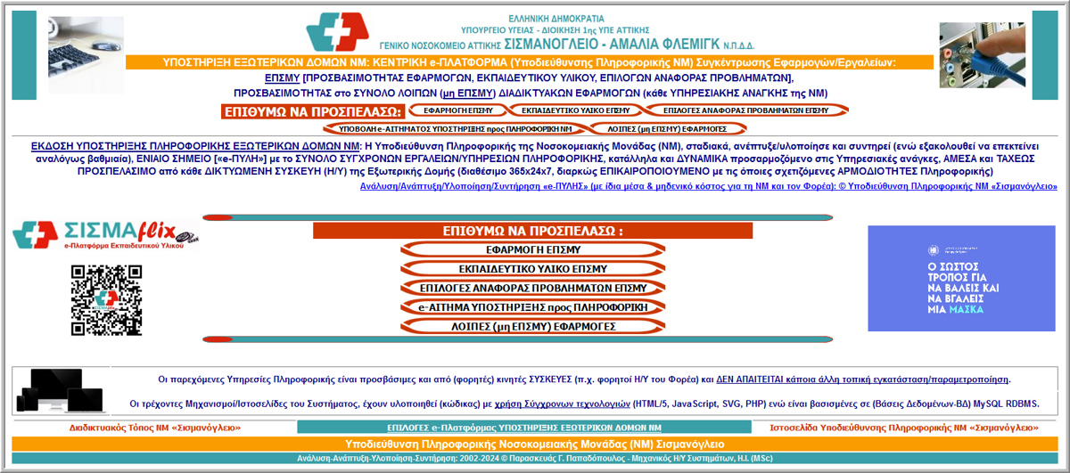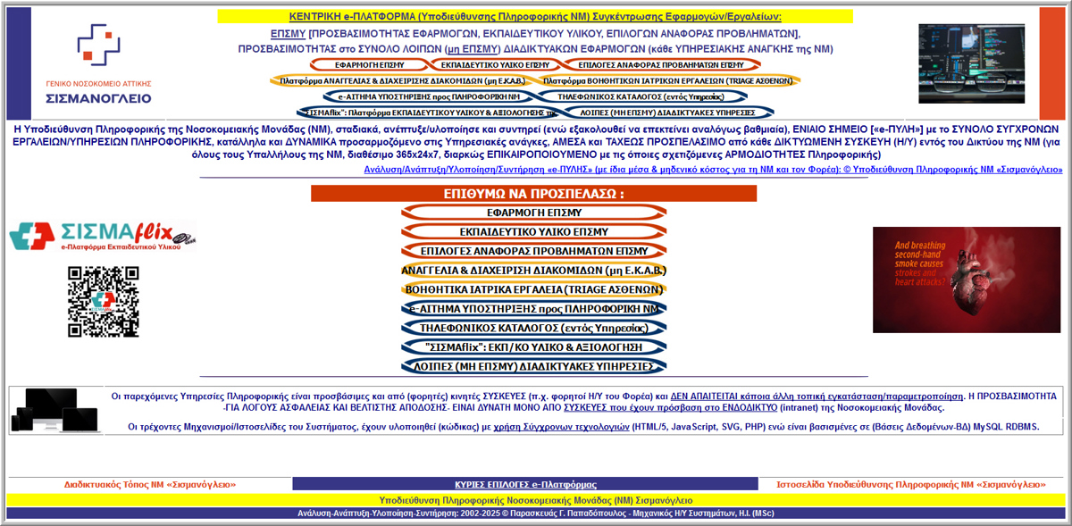 Ανάλυση, Ανάπτυξη, Σχεδιασμός, Υλοποίηση και Συντήρηση Διαδικτυακής e-Υπηρεσίας ‘Ψηφιακός βοηθός εύρεσης προορισμού εντός της Νοσοκομειακής Μονάδας (ΝΜ) «Σισμανόγλειο» [«SISMAssistant»]’ (https://www.sismanoglio.gr/SISMAssistant) [2025] / ΣΤΟΧΕΥΣΗ: η εναλλακτική και ευέλικτη διευκόλυνση του κάθε Επισκέπτη του Νοσοκομείου (με Λειτουργίες και για άτομα που αντιμετωπίζουν προβλήματα όρασης ή/και ακοής, έχοντας ενσωματωθεί λειτουργίες μεγέθυνσης και σμίκρυνσης του αναφερόμενου κειμένου, εκτύπωσης (αποθήκευσης) καθώς και αφήγησης των στοχευμένων παρεχόμενων Οδηγιών), για την ευκολότερη εύρεση και προσέγγιση στον αντίστοιχο επιθυμητό χώρο του Νοσοκομείου κάνοντας χρήση της προσωπικής του συσκευής (π.χ. από το κινητό του τηλέφωνο έχοντας πρόσβαση στο διαδίκτυο). Με χρήση σύγχρονων Τεχνολογιών, έχουν ενσωματωθεί στην e-Υπηρεσία: μηχανισμός ακριβούς μέτρησης της Επισκεψιμότητάς της (για την αποτίμησή της σε επίπεδο αξιοποίησης), «e-ΦΟΡΜΑ ΑΞΙΟΛΟΓΗΣΗΣ» για την ηλεκτρονική δυνατότητα υποβολής Αξιολόγησης/Προβληματισμών των Χρηστών της (με αυτοματισμούς email) καθώς και μηχανισμός Ασφάλειας για την αποτροπή της καταχρηστικής περιήγησης/χρήσης της από «μηχανές». Η e-Υπηρεσία είναι ελεύθερα διαθέσιμη και προσπελάσιμη (24x7x365) από οποιονδήποτε Διαδικτυακά ενώ δεν γίνεται χρήση κανενός τύπου cookie ή/και οποιουδήποτε μηχανισμού τήρησης ευαίσθητων προσωπικών δεδομένων, στα πλαίσια σεβασμού της Ιδιωτικότητας των Χρηστών της (Γ.Κ.Π.Δ./G.D.P.R.):