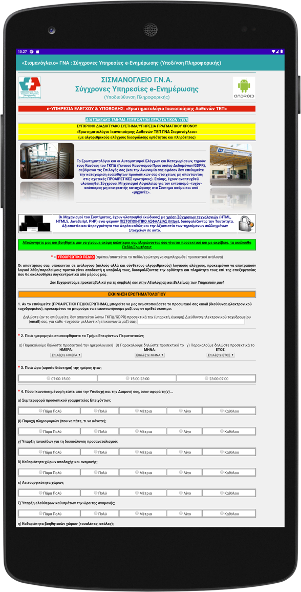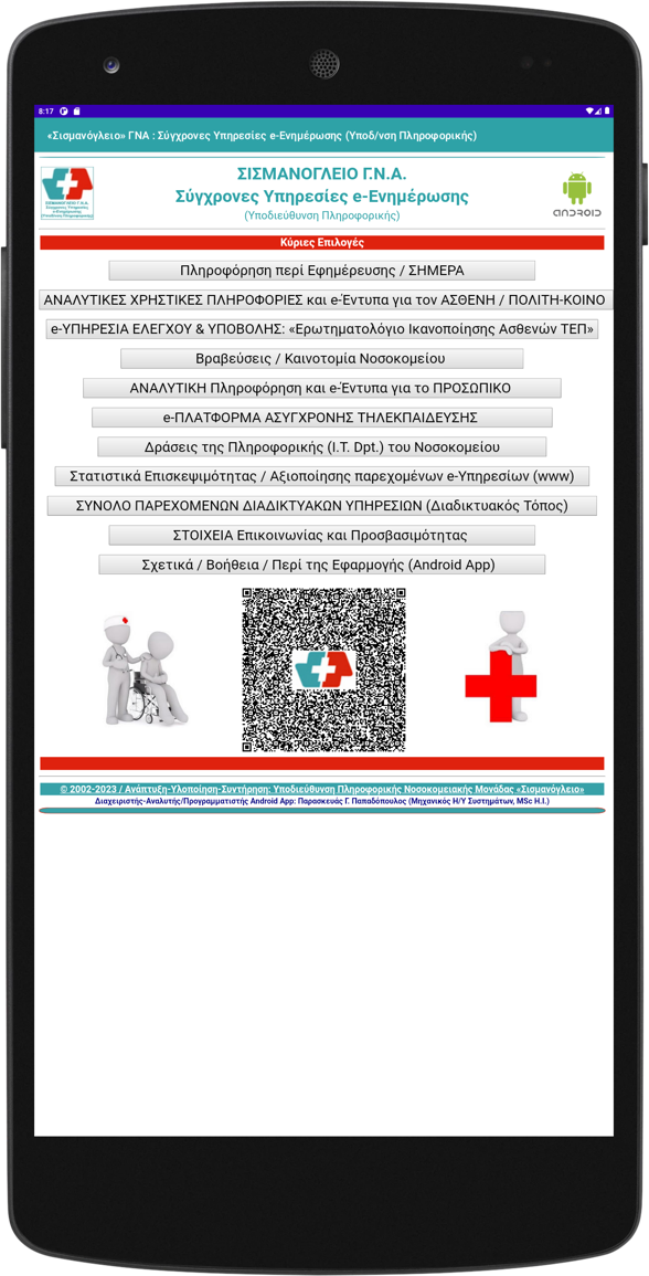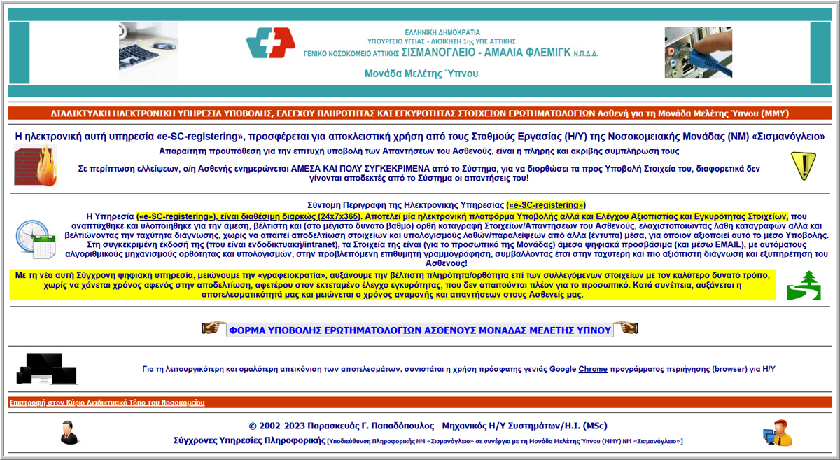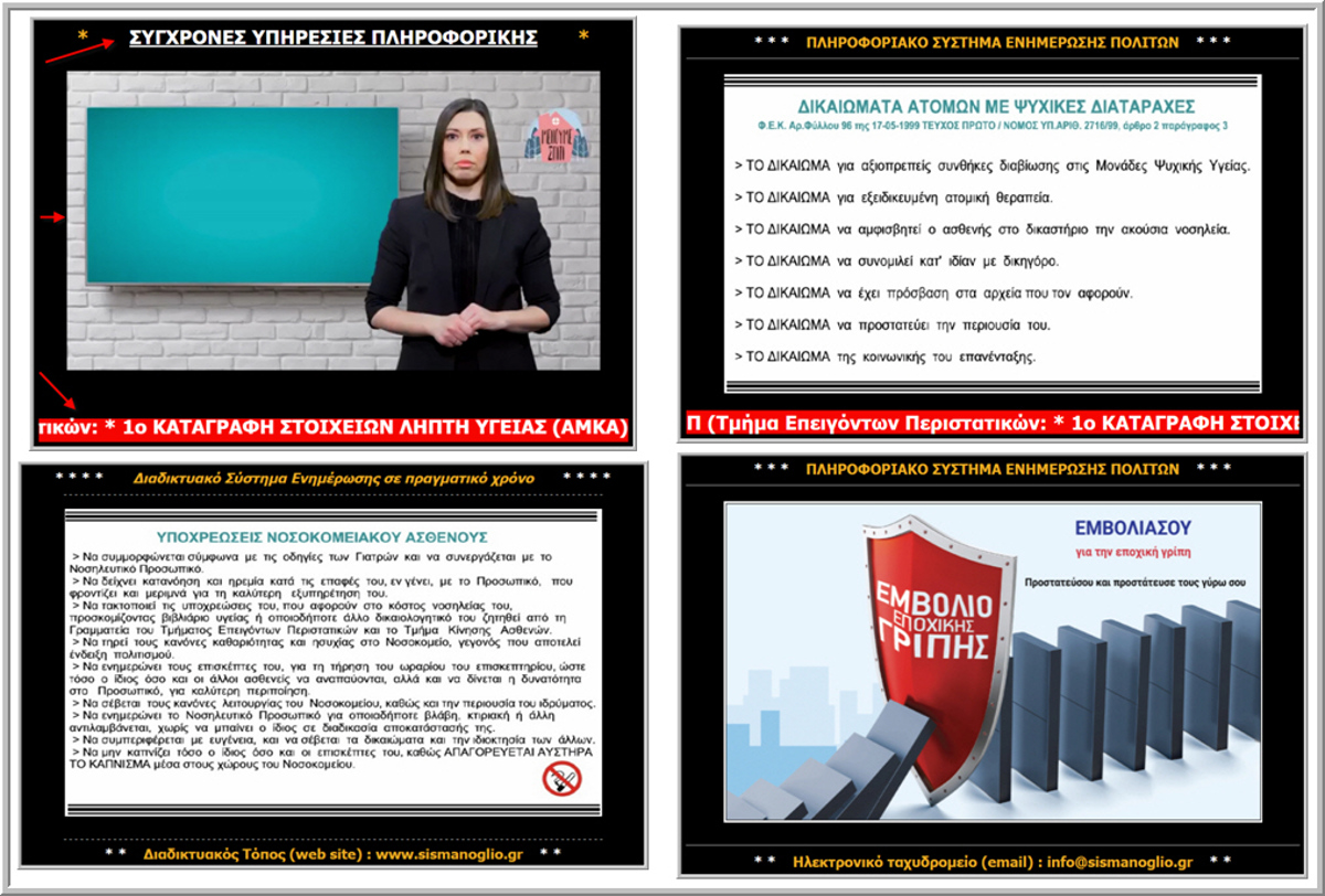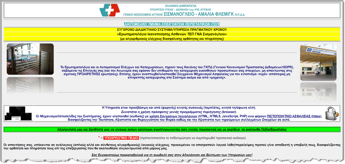 Ανάλυση, Ανάπτυξη, Σχεδιασμός, Υλοποίηση και Συντήρηση Διαδικτυακής e-Υπηρεσίας ‘Ψηφιακός βοηθός εύρεσης προορισμού εντός της Νοσοκομειακής Μονάδας (ΝΜ) «Σισμανόγλειο» [«SISMAssistant»]’ (https://www.sismanoglio.gr/SISMAssistant) [2025] / ΣΤΟΧΕΥΣΗ: η εναλλακτική και ευέλικτη διευκόλυνση του κάθε Επισκέπτη του Νοσοκομείου (με Λειτουργίες και για άτομα που αντιμετωπίζουν προβλήματα όρασης ή/και ακοής, έχοντας ενσωματωθεί λειτουργίες μεγέθυνσης και σμίκρυνσης του αναφερόμενου κειμένου, εκτύπωσης (αποθήκευσης) καθώς και αφήγησης των στοχευμένων παρεχόμενων Οδηγιών), για την ευκολότερη εύρεση και προσέγγιση στον αντίστοιχο επιθυμητό χώρο του Νοσοκομείου κάνοντας χρήση της προσωπικής του συσκευής (π.χ. από το κινητό του τηλέφωνο έχοντας πρόσβαση στο διαδίκτυο). Με χρήση σύγχρονων Τεχνολογιών, έχουν ενσωματωθεί στην e-Υπηρεσία: μηχανισμός ακριβούς μέτρησης της Επισκεψιμότητάς της (για την αποτίμησή της σε επίπεδο αξιοποίησης), «e-ΦΟΡΜΑ ΑΞΙΟΛΟΓΗΣΗΣ» για την ηλεκτρονική δυνατότητα υποβολής Αξιολόγησης/Προβληματισμών των Χρηστών της (με αυτοματισμούς email) καθώς και μηχανισμός Ασφάλειας για την αποτροπή της καταχρηστικής περιήγησης/χρήσης της από «μηχανές». Η e-Υπηρεσία είναι ελεύθερα διαθέσιμη και προσπελάσιμη (24x7x365) από οποιονδήποτε Διαδικτυακά ενώ δεν γίνεται χρήση κανενός τύπου cookie ή/και οποιουδήποτε μηχανισμού τήρησης ευαίσθητων προσωπικών δεδομένων, στα πλαίσια σεβασμού της Ιδιωτικότητας των Χρηστών της (Γ.Κ.Π.Δ./G.D.P.R.):