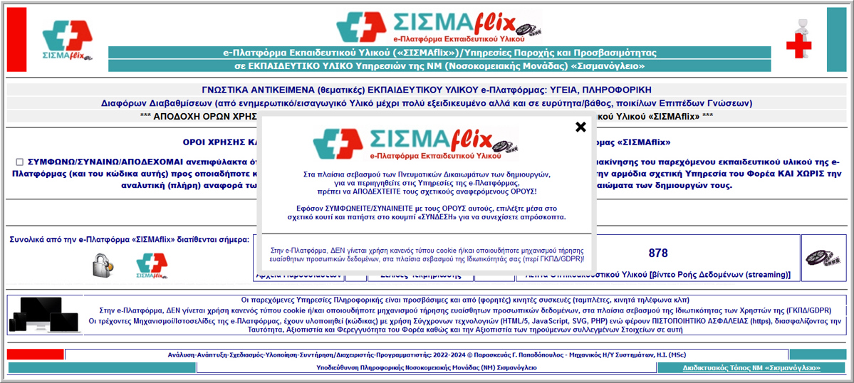 ΣΤΟΧΕΥΣΗ της e-Πλατφόρμας «ΣΙΣΜΑflix»: Η ΒΕΛΤΙΩΣΗ των παρεχομένων ΥΠΗΡΕΣΙΩΝ των Υπαλλήλων (της ΝΜ αλλά δυνητικά και άλλων ενδιαφερομένων Εργασιακών Τομέων/ΝΜ) προς τους Πολίτες (Ασθενείς), προσδίδοντας μία εναλλακτική -ΣΥΓΧΡΟΝΗ- επιλογή στις «ρευστές» αδυναμίες που δυσχεραίνουν την απρόσκοπτη παρακολούθηση προγραμμάτων δια ζώσης (λόγω βαρδιών και ανελαστικών έκτακτων Υπηρεσιακών αναγκών που ανακύπτουν από την φύση της εργασίας του προσωπικού στις ΝΜ). Επίσης, η ΠΑΡΟΧΗ πλέον ενός νέου ΜΕΣΟΥ για την ΕΝΗΜΕΡΩΣΗ/ΕΠΙΜΟΡΦΩΣΗ και των ΠΟΛΙΤΩΝ/ΚΟΙΝΟΥ, αφού τα ΓΝΩΣΤΙΚΑ ΑΝΤΙΚΕΙΜΕΝΑ που καλύπτονται, αφορούν ευρύτερα την ΥΓΕΙΑ και την ΠΛΗΡΟΦΟΡΙΚΗ, διαφόρων Διαβαθμίσεων (από ενημερωτικό/εισαγωγικό Υλικό μέχρι πολύ εξειδικευμένο αλλά και σε ευρύτητα/βάθος