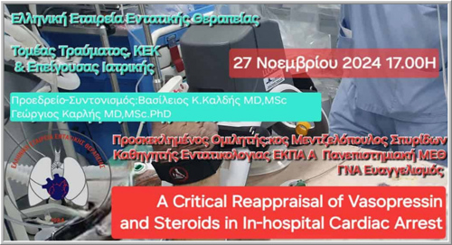 WEBINAR Τομέα Τραύματος, ΚΕΚ & Επείγουσας Ιατρικής της ΕΕΕΘ με Θέμα "A Critical Reappraisal of Vasopressin and Steroids in In-hospital Cardiac Arrest" [προσκεκλημένος ομιλητής: κος Μεντζελόπουλος Σπυρίδων, Καθηγητής Εντατικολογίας ΕΚΠΑ, Α' Πανεπιστημιακή Κλινική Εντατικής Θεραπείας ΕΚΠΑ, ΓΝΑ Ευαγγελισμός] |