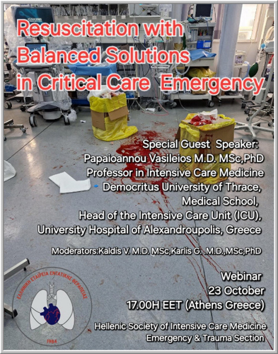 Επιστημονική εκδήλωση/Webinar με Θέμα "Αναζωογόνηση μέσω της χορήγησης Ισοζυγισμένων Διαλυμάτων στην Εντατική Θεραπεία" [με κύριο μοναδικό ομιλητή τον αξιότιμο κο Παπαϊωάννου Βασίλειο, MD, MSc, PhD Καθηγητή Εντατικολογίας και Υπολογιστικής Ιατρικής ΔΠΘ, Διευθυντή ΜΕΘ ΠΓΝ Αλεξανδρούπολης] Προεδρείο: κος Καλδής Βασίλειος MD, MSc / κος Καρλής Γεώργιος MD, MSc, PhD |